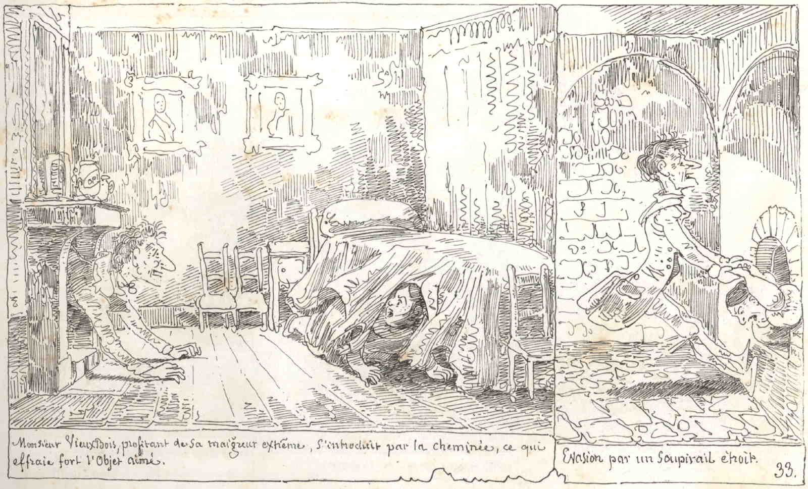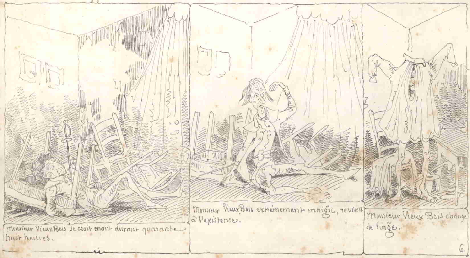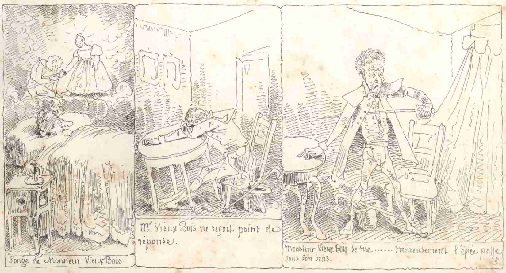The third suicide. Being told that his engagement is off, Monsieur Vieuxbois drinks hemlock. Fortunately it is just herbal soup. - Monsieur Vieuxbois believes himself to be dead for eight days. - The rats have chewed away the front legs of his chair, causing Monsieur Vieuxbois to fall and come back to life.